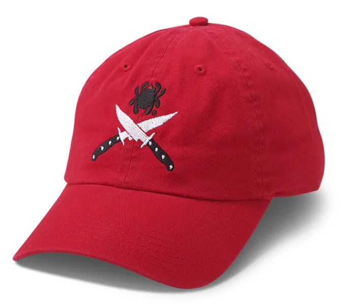 This unstructured ball cap is made of red 100 percent brushed cotton twill and is embroidered on the front with crossed…