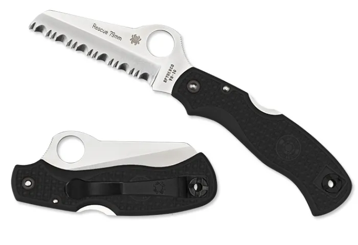 A smaller equivalent of the C14 93mm Rescue, it too has a flat saber-ground, SpyderEdge, VG-10 blade that ends in a sheepfoot safety tip. For smoother thumb rotation we enlarged the Spyderco Trademark Round Hole, which in turn creates a prominent hump to position the thumb on while cutting. The FRN waffle textured handle is available in indigo blue, black and safety orange with an ambidextrous, tip-up pocket clip.