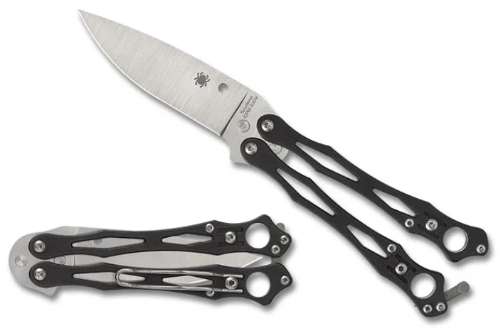 The original SmallFly was a uniquely different “spin” on the balisong, or Filipino butterfly knife. Now this remarkable design is back with an all-new full-flat-ground, drop-point blade profile crafted from CPM S30V. Like the original, it features skeletonized twin handles with full stainless steel liners and peel-ply-textured scales. The Round Holes at the butt end of both handles reflect Spyderco’s iconic trademark and help achieve optimal balance for high-speed manipulation. A spring-loaded latch attached to the “free” handle secures the handles together in the closed position, while the removable wire pocket clip may be attached to either side of both handles as both a carry option and tactile index.