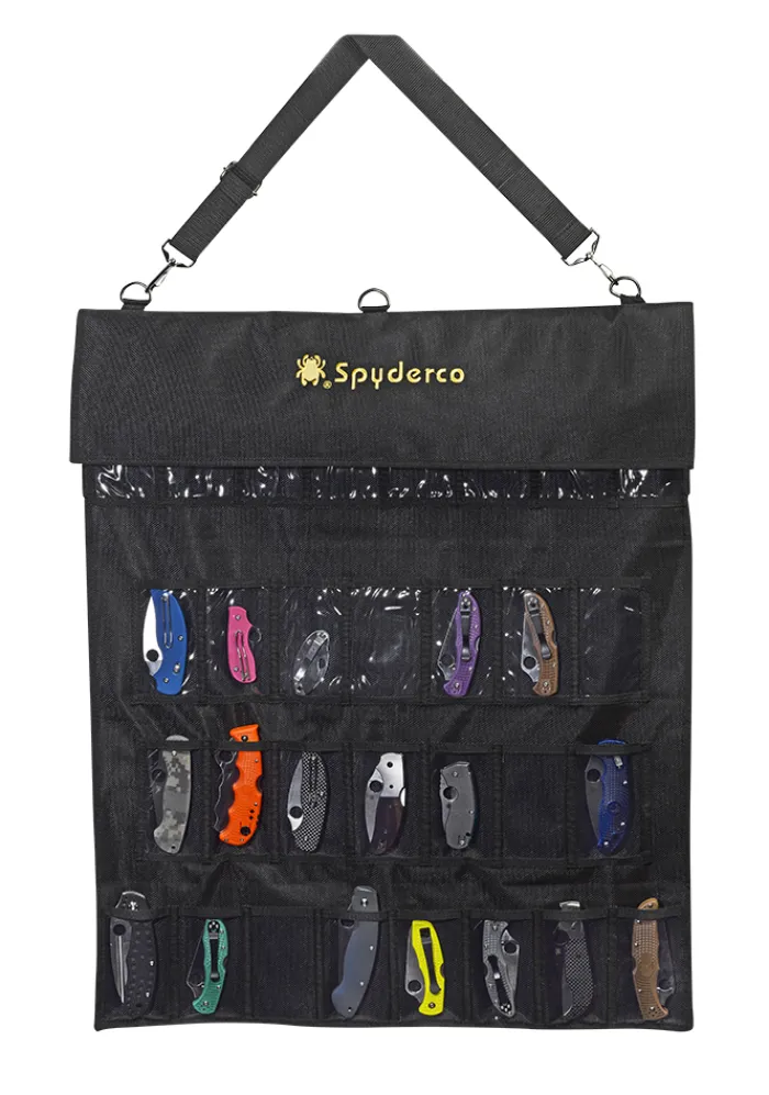 Constructed from heavy-denier polyeste Cordura, the pack has thirty deep pockets sized to hold even larger folders. Each pocket is fronted with a clear plastic window for viewing knives tucked inside. It tri-folds over and seals closed by way of a Velcro strip running the width of the pack. The knives remain secure and separated in their pockets and cannot rub or scratch against each other. An adjustable length shoulder strap attaches with two durable steel D-rings letting you hang the pack for display on a wall or sling it over your shoulder to take with you. Spyderco’s name and bug logo are embroidered in gold thread on the closing flap. Available in black.