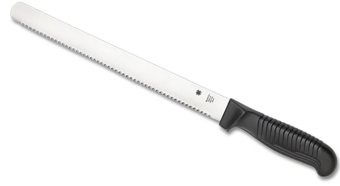 Few kitchen cutting chores challenge a serrated edge more than cutting bread—especially soft, freshly baked bread. Spyderco’s all-new K01 Bread Knife redefines the breed by combining our time-tested original design with more than 40 years of hard-earned experience and in-depth research and development of serrated edges. The K01’s exceptionally thin blade is crafted from corrosion-resistant MBS-26 stainless steel and expertly heat treated to yield a superior combination of sharpness, edge retention, and flexibility. It features a highly refined serration pattern that cuts soft breads and cake without crushing or tearing, yet is still capable of powering through hard-crusted baked goods almost effortlessly. The exceptionally long blade adds to the knife’s cutting power and control, supporting clean, precise push or pull cuts with equal ease. To ensure a secure, comfortable grip and construction that will stand the test of time, the K01features an ergonomic, textured polypropylene handle with a stepped texture that is injection molded directly onto the tang.