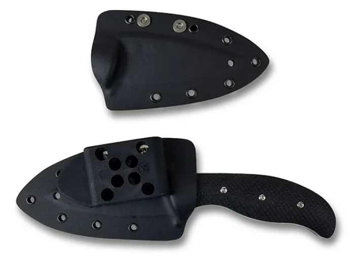 This custom-molded Boltaron® sheath provides the perfect turnkey carry solution for your Mule Team blade. Designed specifically to fit a Spyderco Mule Team blade equipped with our “bolt-on” G-10 handle scales (sold separately), this snap-fit sheath retains the knife securely while leaving most of the handle exposed for a quick, positive draw. The sheath comes complete with a fully configurable G-Clip™ attachment that supports both belt carry, and clip-on inside-the-waistband carry. Angle adjustable for vertical, horizontal, or canted positioning, the G-Clip can also be mounted on either side of the symmetrical sheath for edge-forward or edge-back carry. This high-quality sheath is also assembled with eyelets instead of rivets to allow it to be easily lashed or zip-tied to packs and other platforms.
